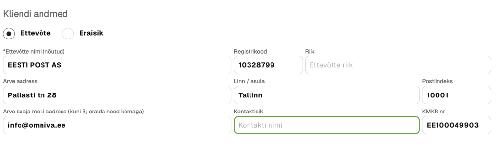 - Ostja (ettevõte): Kui klient on juriidiline isik, märgi tema nimi, registrikood ja aadress. Kui Sinu klient on käibemaksukohustuslane, peab arvel olema ka tema maksukohustuslasena registreerimise number.