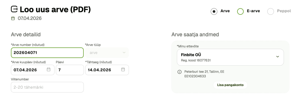 - Makseinfo: Lisa pangakonto number (IBAN) ja soovitavalt ka kontaktandmed (e-post, telefon), et küsimuste korral saaks kliendi raamatupidaja Sinuga ühendust võtta.