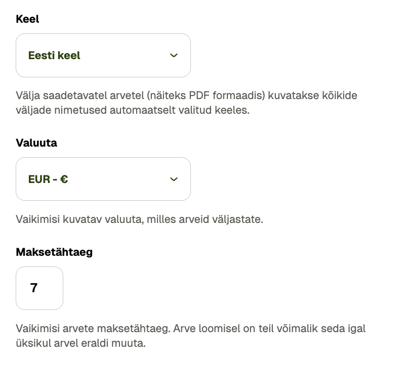- Viivis: Kui soovid hilinenud maksete eest viivist küsida, on hea, kui see määr on arvel varem kajastatud.